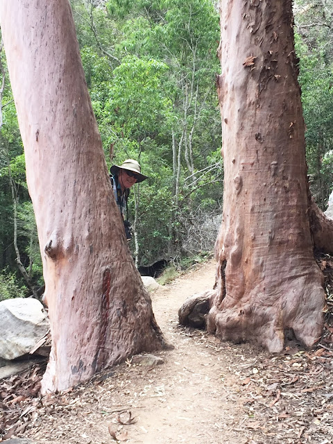The trail towards Dragon Cave first crosses a dry creek bed near the opening of Russell Gully, then continues steadily climbing through the scrub and coming up to the base of the cliffs on the other side of the gully. From the junction heading towards Gorge Lookout and Castle Mountain Lookout, the trail leads to several flights of stairs to get to the top of the cliffs. We made the climb to check out Gorge Lookout...