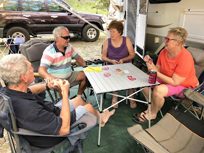 After we all enjoyed a bit of a nap, it was time to get out the cards again. The beauty of down time out here at Cania, means that most afternoons finds us playing cards... We have introduced Barb to "Five Crowns" our favourite game to play at the moment, and I am not sure whether it is beginner's luck or what, but it seems that most afternoon she beats us. John is not really a games person but he did join us under the annex but he was happiest reading his book...