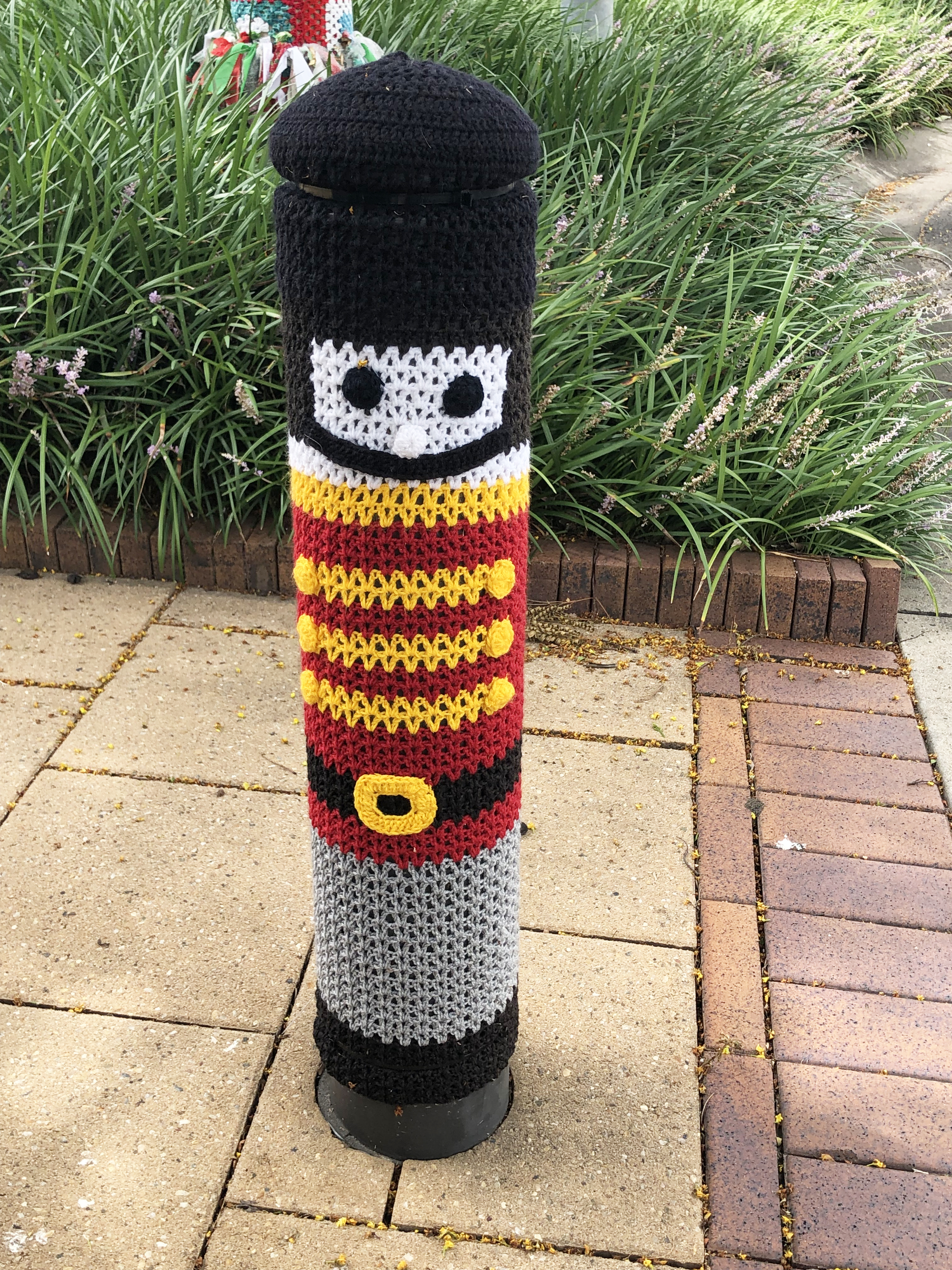 Apparently, the "Yarnbombing for Christmas" group of woman from the community meet weekly from February at the start of the year to add to the wonderful decorations that decorate the town. They met on the stage area in Jubilee Park for two hour from 9.30am to 11.30am on a Tuesday and as it gets closer to Christmas from September on, meet both Tuesday and Wednesday. Even those that can't stick or crochet can contribute by donating fabric and wool to a box at the the local library, and then the resources can be collected from the library by those that are very handy to a crochet or knit.