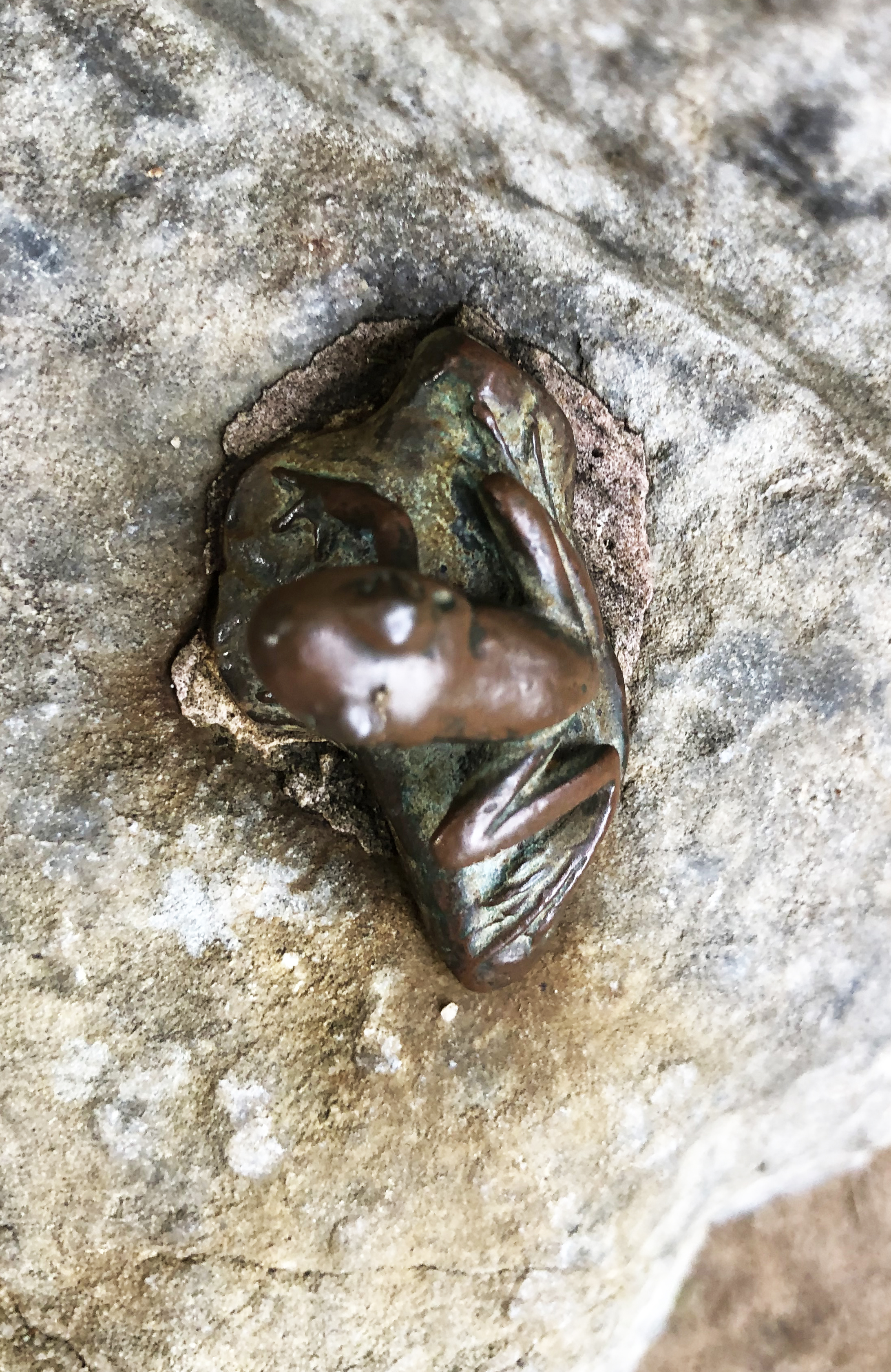 In the early days, when volunteers were working at clearing the bush of weeds and exotic trees, a carpet snake, which they called Axminster, resided here. This sculpture by Silvio is fondly called Axminster by the Friends of the Gardens. Silvio finished the sculpting, but after the initial work was finished, the sculpture needed to be polished. Volunteers wore out many fingertip rubber gloves doing this polishing, starting with rough sandpaper and ending the process with the finest of sandpaper. Because volunteers did the polishing, Silvio could move on to a new sculpture, instead of spending his limited time polishing. The Python regularly gets a treatment of sanding and oiling to keep it shiny and you can feel the smoothness of the beautiful snake. Silvio sometimes, but not always, adds to his works a small frog which is not always easy to find. The kids were really keen to find this little frog and it didn't take them too long to find it. It then set the bar for finding the frogs with the rest of his works within the gardens as well.