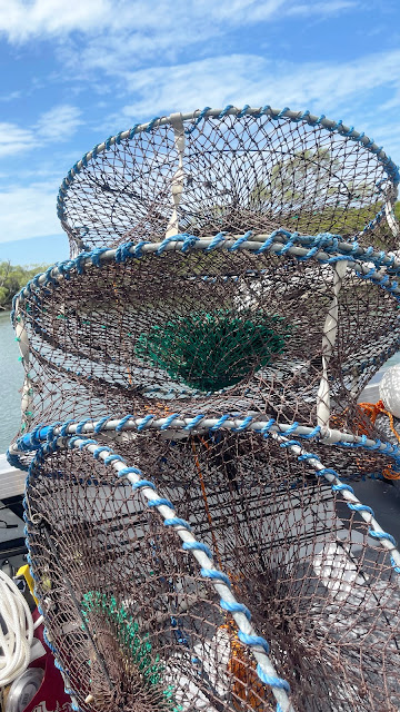 I love the motor guide, I love that we no longer have to throw out an anchor and that this little motor just anchors you where you tell it too. Once Steve had it working, it was then time to bait up all the pots.. He had bought a few bags of what he thought were old fish carcasses from home to bait the pots with. All was going well until he opened the first bag when he discovered that it didn't contain any carcasses at all but was a bag of old crab shells. Well they just went staight into the ocean... This meant that we would need to be a little more careful with out bait now if we wanted to bait all the pots...